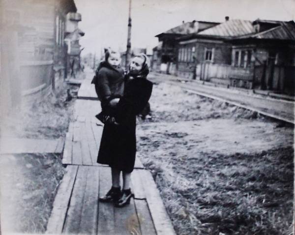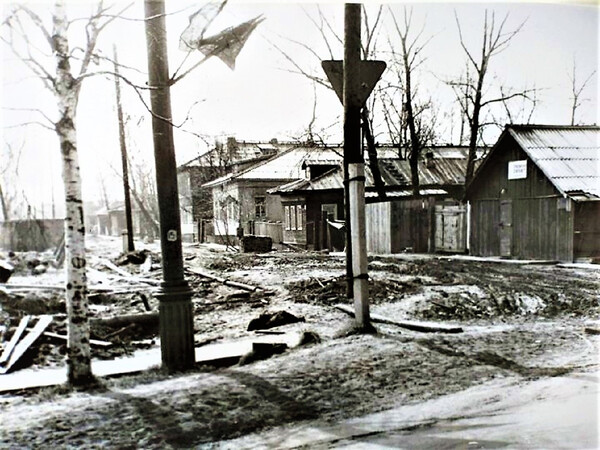 Старый Архангельск мне удалось найти фотоснимок того же самого участка улицы Смолокурова, но сделанного Александром Квасниным ровно 35 лет спустя - в мае 1982 года. То есть тогда, когда чётная сторона улицы уже была снесена, а ещё стоявший на нечётной детсад № 60 (дом № 47) доживал последние недели или месяцы. Привожу два фото — 1957 и 1982 годов — вместе: