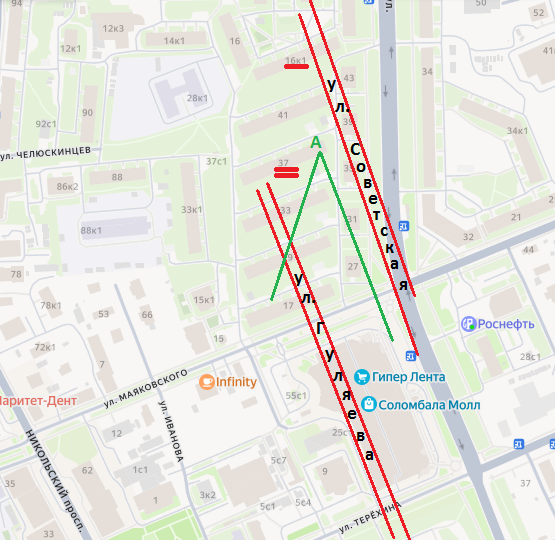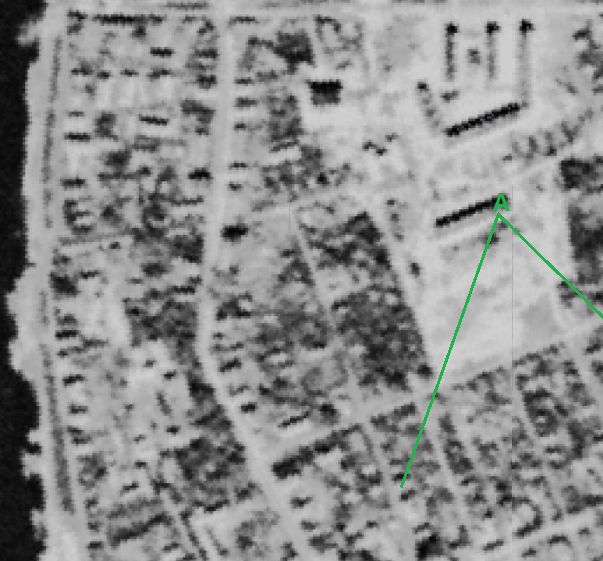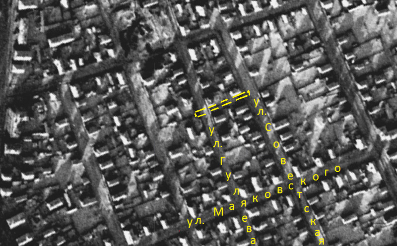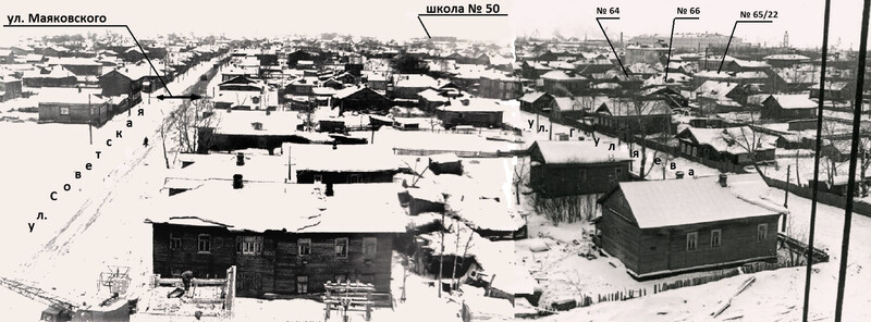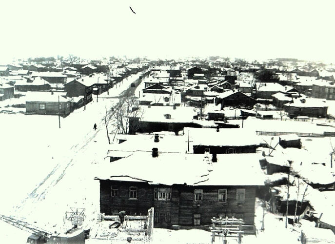 В недавнем сообщении Смолокурова и Приютский я совершил ошибку, а именно написал, что этот снимок 1968-1969 годов был сделан со строившейся панельной пятиэтажки по адресу: улица Красных Партизан, 16, корпус 1. ![]() На самом же деле фотограф находился на другом строившемся здании — на такой же типовой пятиэтажке, получившей адрес по улице Советской — дом № 37. Она помечена на современном плане Соломбалы. На нём же показаны прежнее направление улицы Советской и снесённый участок улицы Гуляева. И точка А, откуда делал снимок фотограф: ![]() Но фотограф не ограничился одним снимком, и с той же точки А сделал и второй, на котором заечатлена лица Советская (т точнее, старая застройка её прежнего направления. Этот снимок я так же заимствовал из фотоальбома ВК-паблика Старый Архангельск): А на фрагменте спутникового фотоснимка Архангельска 1970 года (сайт Signum Temporis) показал, в каком ракурсе был сделан второй снимок: ![]() Как видите, все запечатлённые на втором фото дома, стоявшие перед строившейся пятиэтажки до улицы Маяковского к 1970 году были снесены. Но зато они есть на спутниковом снимке 1967 года, на которой прерывистыми линиями показано место, где через год началось строительство 37-го дома по улице Советской: Два сделанных с этого дома фотоснимка я попытался смонтировать. Получившееся фотоизображение старой Соломбалы, конечно, далеко от идеала, но зато оно даёт представление, какой она была — застройка почти полностью деревянная и дореволюционная. За малым исключением — построенным в 1936-1937 годах зданием 50-й школы, виднеющемся вдали: ______________________________________________________Предыдущий пост - Перекрёсток Маяковского/Георгия Иванова |