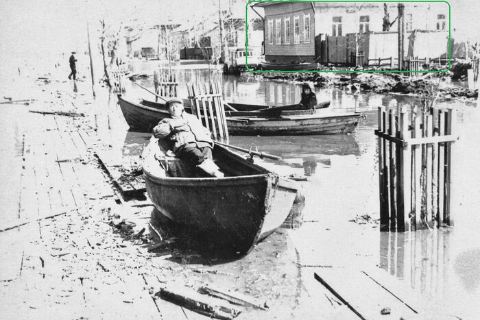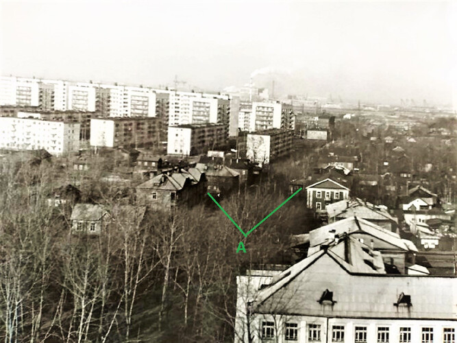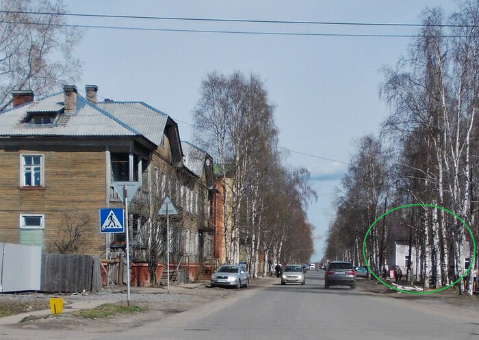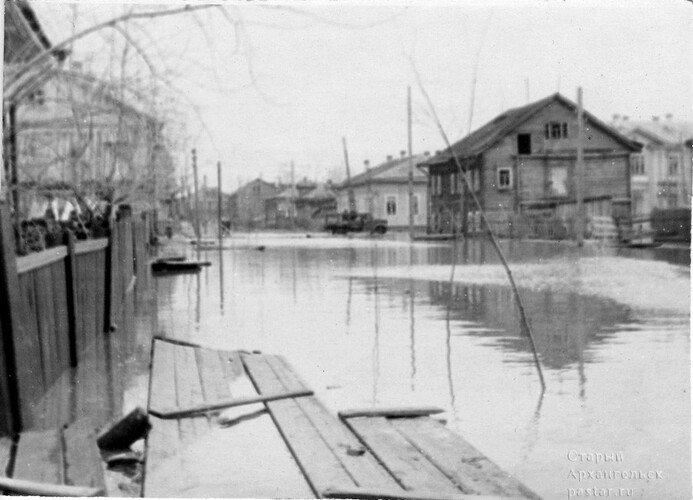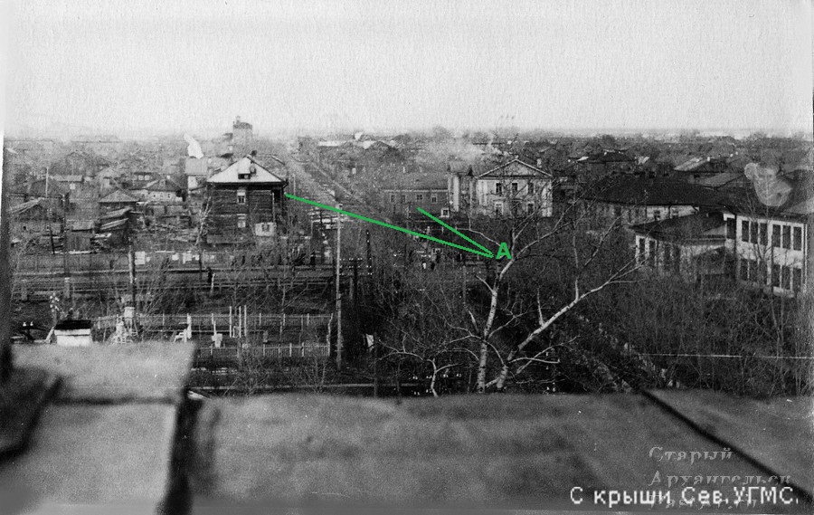 Продолжая фотопутешествие по старой Соломбале, сегодня привожу снимок 1920-х годов, который мне давным-давно прислал земляк-соломбалец Дмитрий Бычихин — опять же для уточнения места съёмки: ![]() Определить, на какой улице Соломбалы стояли два двухэтажных дома, мне удалось, так как весной 2016 года я их как раз сфотографировал — это были угловые дома на пересечении улиц Маяковского и Георгия Иванова: На фото 1920-х снимке напротив первого из них, то есть по чётной стороне улицы Маяковского, хорошо виден одноэтажный угловой дом, котором по крайней мере до 1980-х годов размещалась районная библиотека. А На снимке 2016 года это здание едва просматривается, тем не менее, судя по его фрагменту можно сказать, что оно перестроено. А до реконструкции выглядело таким, каким было запечатлено на фото 1966 года — в дни последнего настоящего соломбальского наводнения (в рамке зелёного цвета): Оно же, перестроеннное — в зелёном овале — на моём фотоснимке 2014 года: Здание библиотеки, как и почти вся улица Маяковского хорошо просматриваются и на фотографии 1960-х, заимствованной с сайта Старый Архангельск. На ней точкой А я пометил место, откуда был сделан снимок 1920-х годов: Правда, на ней едва заметен первый из тех угловых одноэтажных домов. Зато они хорошо видны на фото 19809-х из фотоальбома ВК-паблика Старый Архангельск: Нашлось и ещё одна фотография перекрёстка улиц Маяковского и Георгия Иванова, но сделанная так, что упомянутые два дома запечатлены на ней с тыльной стороны (со дворов), а здание библиотеки оказалось между ними (за автомашиной): В заключение остаётся сказать, что в 2023 году тот же самый перекрёсток улиц Маяковского и Георгия Иванова выглядел так: ______________________________________________________Предыдущий пост - О том, что кроме набережной... |