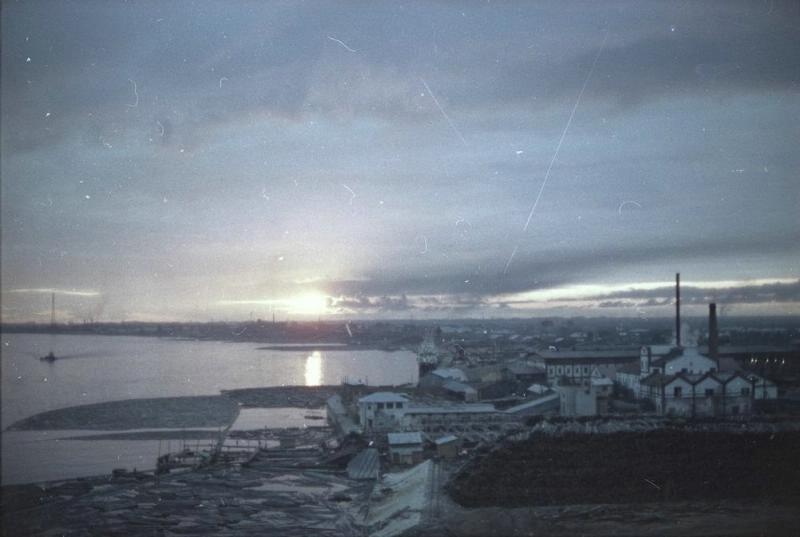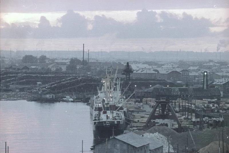 Продолжая рассказ об архангельском лесозаводе № 3 (ЛДК им. Ленина), сегодня привожу два заимствованных с сайта pastvu фотоснимка начала 1970-х годов. Первый из них был сделан в сторону улицы Красной Звезды, на которой достраивалось здание управления «Архстройтранса» (рядом с ним виден кран): А датирую снимок началом 1970-х по той причине, что на территории биржи ЛДК им. Ленина ещё велось строительство ближнего к Ленинградскому проспекту склада (стоят лишь вертикальные балки-опоры), а вдоль проспекта ещё не возведён четырехэтажный административно-бытовой корпус биржи (официально — цеха сушки и обработки)ю С той же точки, но в другом ракурсе запечатлена другая часть биржи, а за ней — жилые дома заводского посёлка: С первого из запечатлённых башенных кранов был сделан (правда, ещё в 1960-х) третий фотоснимок — в сторону Северной Двины: А на следующем снимке (видимо, начала 1970-х) помимо штабелей круглого леса (пиловочника) — Ленинградский проспект и микрорайон Варавино: Эта фотография была сделана с одного из двух гигантских козловых кранов производства ГДР: ![]() С него же фотожурналист Всеволод Тарасевич в 1965 году запечатлел проходивший мимо комбината пассажирский теплоход: ![]() водный и лесопильный цеха: ![]() причал и то, что находилось в 1965 году далее, то есть за остановкой «Такелажная» — на берегу в районе улицы Красной Звезды и нынешнего Майского парка. А именно опять же штабели пиловочника: ![]() Последним снимком почти круговое фотопутешествие по территории Третьего, можно сказать, завершилось. А что осталось от запечатлённого на снимках 1960-1970-х годов, может увидеть каждый проезжающий по Ленинградскому проспекту — увы, кроме складов, ничего... ______________________________________________________Предыдущий пост - Вновь о том же заводе |