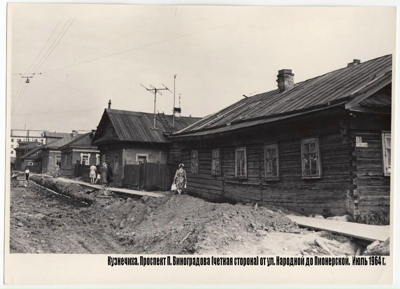 Брат известного театрального режиссёра Василий Иванович Немирович-Данченко в сборнике путевых очерков «Беломорье и Соловки» (Киев, 1892) писал: Что за жалкое место Кузнечиха! После чистенького, опрятного Архангельска эта часть его показалась нам гнездом нищеты и убожества: кривые улицы, узкие переулки, деревянные домишки, покосившиеся, потрескавшиеся, похожие на физиономию пьяного забулдыги, сплошь усеянную синяками и шрамами. Длинные заборы, за которыми скрываются черные пустыри, хижины в одно и два окна. Невольно думалось нам: как скверно, должно быть, живется тут людям!.. Тот, кто помнит, какой была Кузнечиха до начала 1960-х годов, может сказать, что её облик мало чем отличался от вышенаписанной неприглядной картины. Так как она была тупиковой частью города, причём даже тогда, когда в Архангельске появилось трамвайное движение. Ибо трамваи поначалу ходили лишь до Пермской (ныне Суворова) улицы. Даже когда появилось вокруг Кузнечихи трамвайное кольцо, этот факт практически никак не повлиял на её облик. Конечно, пуск в 1956 году в эксплуатацию Кузнечевского моста в Соломбалу повлиял на судьбу Кузнечихи — начались подготовительные работы по застройке Госпитальной (Гагарина) улицы. Как первоначально планировалось жилыми домами-сталинками. Но успели построить лишь два таких дома — угловых дома на Набережной, потому что началась борьба с украшательством в архитектуре и соседние дома оказались хрущёвками — по фамилии инициатора этой борьбы.