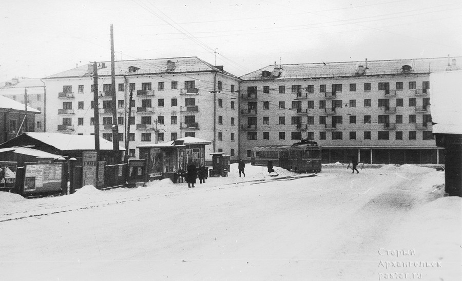 Эту картину можно было бы и удлинить, так как ранее я сделал аналогичный монтаж двух заимствованных с сайта Старый Архангельск снимков, на которых запечатлён перекрёсток того же проспекта и улицы Комсомольской: