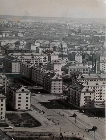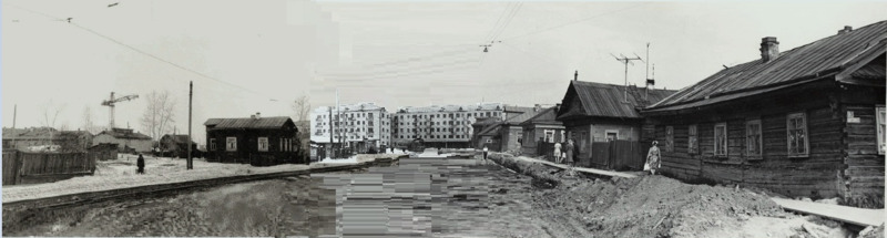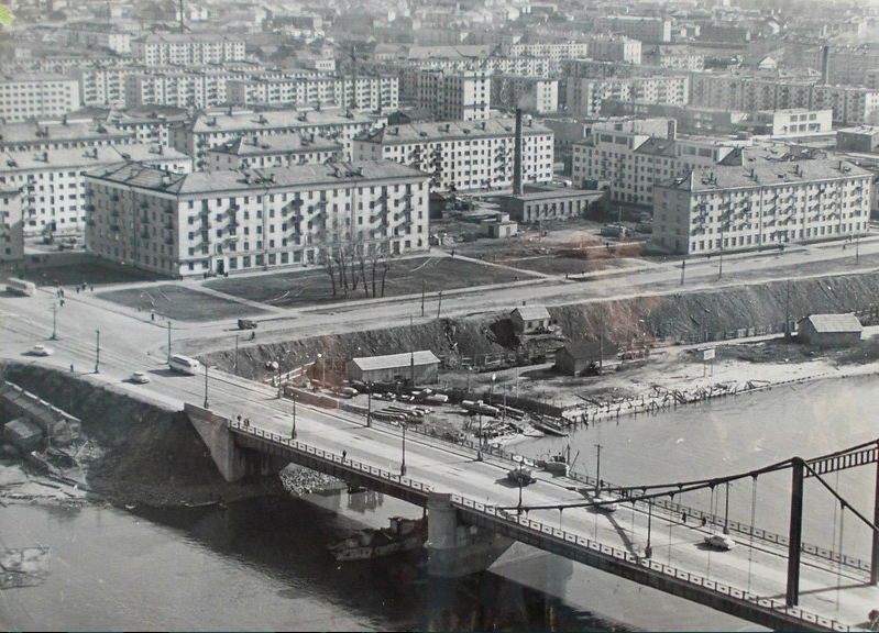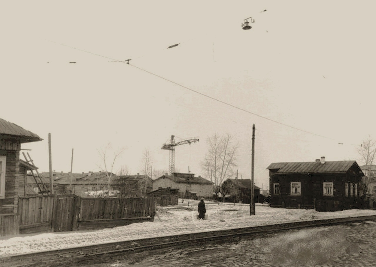 Есть эти пятиэтажки-хрущёвки (как и стоявшие на Павлиновке деревянные дома) и на ещё одном снимке, заимствованном мной из фотоальбома Дмитрия Бычихина: