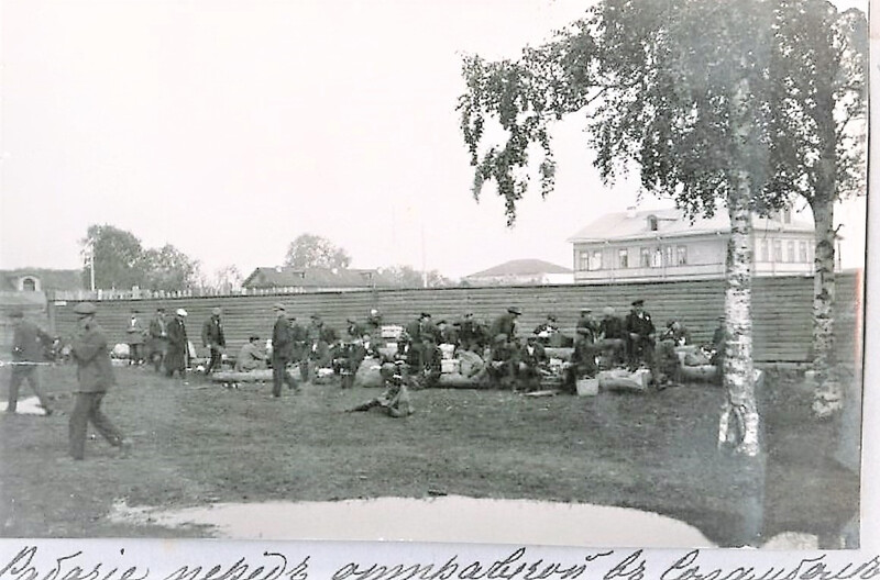 Этот фотоснимок, заимствованный из фотоальбома ВК-паблика Старый Архангельск и датированный 1914-1916 годами, меня весьма озадачил. Так как я никак не мог понять, где именно в Соломбале рабочие под забором ожидали посадки в пароход: А ожидали они возле забора — забора капитального, а не сколоченного на быструю руку — на время строительства. Например, такого, какой смастерили при возведении Народного дома имени Петра Первого: