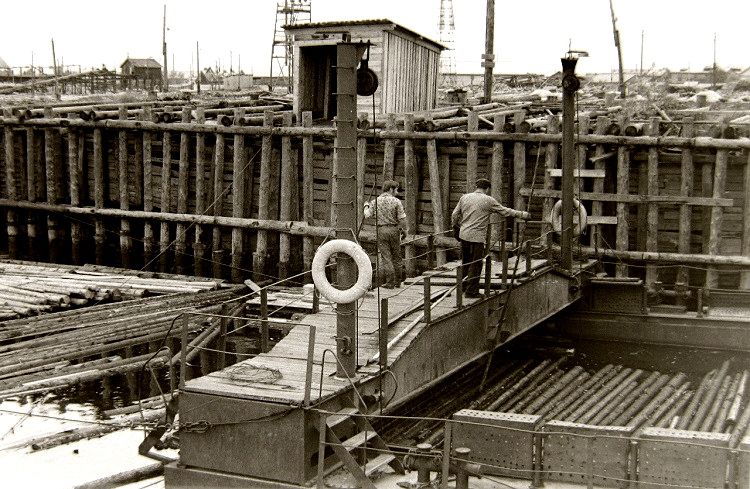 Завершая рассказ о снимках Николай Антонова середины 1970-х годов, сегодня привожу фото, сделанные летом 1974-го во время экскурсии или производственной практики студентов АЛТИ в располагавшемся на острове Бревенник Маймаксанском лесном порту (МЛП) — архангельском лесоэкспортном предприятии, специализировавшемся на поставках за границу частично обработанной лесопродукции. И именно окоренных брёвен и короткомерных сортиментов — балансов и пропсов. Производственный цикл начинался с подъёма с воды приплавленной по Двине древесины с помощью поперечного элеватора: ![]() |