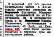 Известно, что словом «Камчатка» именуют не только далёкий от нас полуостров, но и нечто (например, последние парты в классе) пространственно или географически удалённое. Так, одна из деревень бывшего Пучужского сельсовета наряду с официальным названием по сей день иногда называется Камчаткой (встречается подобное её наименование и в дореволюционных архивных документах). А вот применительно к топонимике Архангельска это слово мне не встречалось. Не встречалось, пока на днях я в подшивке газеты «Правда Севера» не прочитал объявление о предстоявшем разводе: ![]() Как видите, в Цигломени была улица Камчатка, причём если судит ... Читать дальше »