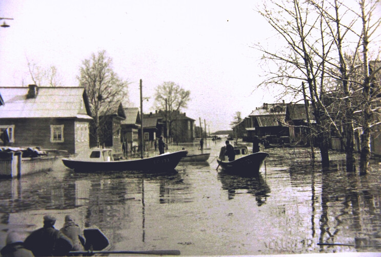 Этот снимок, присланный лет десять назад Дмитрием Бычихиным, помещён мной на обложку ВК-профиля в том числе и по той причине, что в его центре запечатлён я, стоящий на самодельном плоту по середине улицы моего детства — Валявкина: Но привожу это фото сегодня вовсе не для того, чтобы вновь об этом сообщить, а в связи с тем, что на сайте Старый Архангельска вчера встретил ещё один снимок, сделанный в тот же день — 9 мая 1966 года. В противоположном ракурсе, но там же — ... Читать дальше »