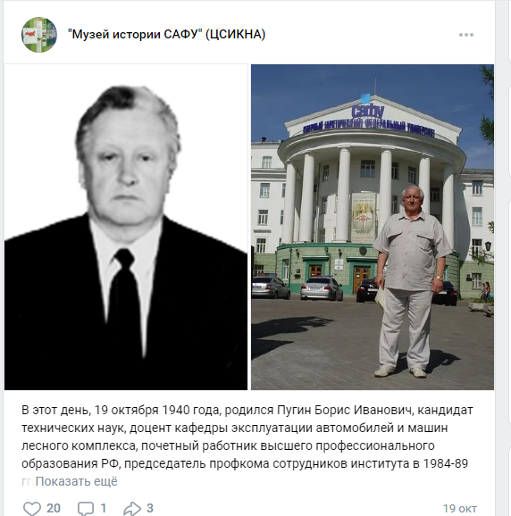 19 октября сообщество «Музей истории САФУ» разместило пост, посвященный преподавателю АЛТИ-АГТУ Борису Ивановичу Пугину, воспоминаниями о котором, точнее, о связанных с ним событиях я давно хотел поделиться. Что сегодня и делаю: ![]() Год назад в сообщении Уточнение к объявлению" я рассказал, по какоЙ причине мне, второкурснику, в сентябре 1975 года довелось участвовать в перевозке мебели и оборудования деканата нашего факультета и ряда кафедр из главного корпуса АЛТИ в новый, только что постро ... Читать дальше »