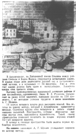 В продолжение вчерашнего поста, привожу ещё один газетный фотоснимок, отчасти дающий представление о том, как в 1953 году в Архангельске начиналась застройка каменными зданиями вокруг возводившегося кинотеатра «Мир» и будущей одноимённой площади: ![]() Из текста следует, что снимок был сделан с высоты третьего этажа дома-сталинки по Набережной имени Сталина, 93, на первом этаже которого планировалось разместить детский сад и гастрономический магазин. Так после завершения его строительства и произошло, и коренные архангелогородцы хорошо помнят открывшийся в нём магазин, причём не иначе как «Десятку». |