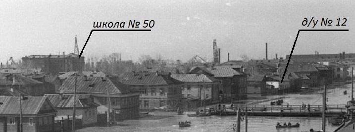 Возможно, кто-то из соломбальцев моего поколения помнит стоявшее на берегу Соломбалки, по адресу улица Краснофлотская, 14, здание в котором до начала 1970-х годов размещалось домоуправление № 12 (после него — соломбальские ГАИ И ВОХР). На фото, сделанном в дни очередного наводнения, оно мной помечено: