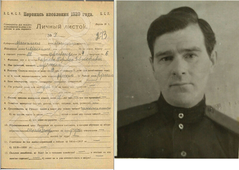 В комментариях к посту Дом Кошкина моя землячка и ВК-друг Светлана Антипина прислала личный листок её деда — Германа Евтефьевича Карпова, заполненный во время переписи населения 1920 года. А прислала по следующей причине: на тот момент 13-летний Герман жил почти напротив бывшего дома Кошкина по адресу улица Церковная, 4, и учился в 7-летней школе I ступени, которая с 1920-го года до середины 1930-х размещалась как раз в этом доме: