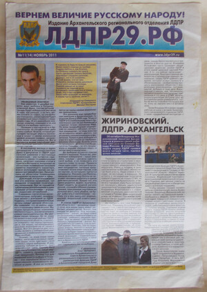 В моей коллекции старых (и не очень старых) газет есть предвыборная агитационная газета местного отделения ЛДПР, изданная в ноябре 2011 года гигантским тиражом — 400 тысяч экземпляров: