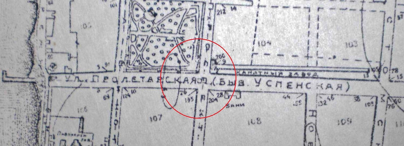 На плане Архангельска 1922 года мной обведён перекрёсток нынешних проспекта Ломоносова (ранее — Петербургского/Петроградского) и улицы Логинова (Пролетарской/Успенской):