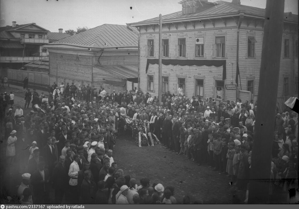 Опять же на сайте pastvu встретил фотоснимок, датированный 1920-1930 годами и названный «Шествие на ул. Диатоловича». На нём действительно запечатлена архангельская улица Диатоловича (впоследствии — Правды/Кронштадтского), точнее, дом № 3, перед которым проходила траурная церемония прощания с покойным.