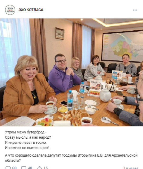 На днях в паблике Эхо Котласа был размещён пост с фотоснимком, на первом плане которого — депутат-единоросс Госдумы Елена Вторыгина, а также министр труда, занятости и социального развития области Владимир Торопов и депутат облсобрания Елена Доценко (понятно, тоже единоросска). В общем, представители современной партноменклатуры: