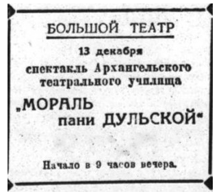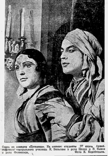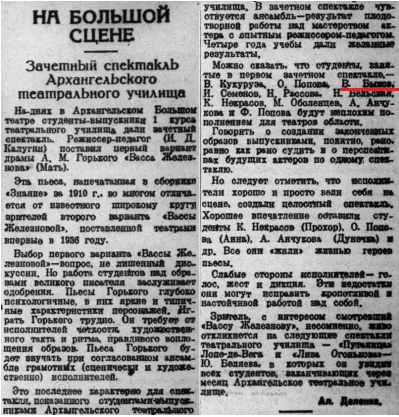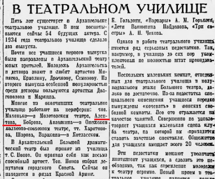 Вчера скоропостижно ушла Вера Алентова, и в связи с этим печальным событием уже произнесено и ещё будет сказано много слов прискорбия и сочувствия. Но вряд ли они (в том числе и мои) смягчат горечь утраты... Тем не менее я всё же скажу несколько слов, вернее, напомню, что Вера Валентиновна — уроженка нашей области, точнее, города Котласа, и сообщу малоизвестные факты о её родителях — Ирине Николаевне Алентовой (1917-1988) и Валентине Михайловиче Быкове (1917-1946), так как их судьбы были связаны с Архангельском. Если быть точнее, они в 1939-1940 годах закончили Архангельское театральное училище, которое размещалось в здании драматического (тогда — Большого) театра: ![]() Впервые мне стало об этом известно, когда в подшивке газеты «Правда Севера» за 1939 год встретил объявление о спектакле под названием «Мораль пани Дульской», роли в котором исполняли студенты училища: ![]() Затем встретилась рецензия на зачётный спектакль «Васса Железнова», в которой упоминается Валентин Быков: ![]() А в другой газетной публикации (от 4.04.1939), посвященной артистке Большого театра и преподавателю училища А.Н. Медведевой, есть упоминание об Ирине Алентовой: — Когда пришла к нам Александра Николаевна, — говорит ученица выпускного курса, отличница Харитонова, — у нас сразу же появилась определенная четкая система учебно-творческой работы. А.В. Медведева сумела развить в ученике сценические способности, поднят его активность. Например, ученица Алентова на первых двух курсах была пассивна в работе, отставала. Александра Николаевна помогла ей, сумела заинтересовать её, и вот на зимнем зачётном спектакле Алентовой уже поручили ответственную роль. Она играла Лидию в «Варварах» Горького, и неплохо справилась с этой ролью. Ирина Алентова закончила театральное училище в том же 1939 году и была распределена на работу в Онежский колхозно-совхозный театр, о чём свидетельствуют заметка из газеты «Северный комсомолец» от 16 апреля 1940 года: ![]() В той же газете и за тот же год нашёлся фотоснимок, на котором был запечатлён студент выпускного четвёртого курса Архангельского театрального училища Валентин Быков: ![]() Который через месяц был распределён в Котласский драматический театр. Туда же из Онеги переехала работать и Ирина Алентова. И в Котласе у них родилась дочь, носившая фамилию «Быкова» до 1969 года. А с Архангельском была связана и судьба супруга Веры Алентовой — известного актёра и кинорежиссёра Владимира Валентиновича Меньшова. ![]() Он в 1947-1950 годах жил с родителями на улице Свободы и учился в 6-ой средней школе. ______________________________________________________Предыдущий пост - У дома с вышкой Следующий пост - Новая партноменклатура |