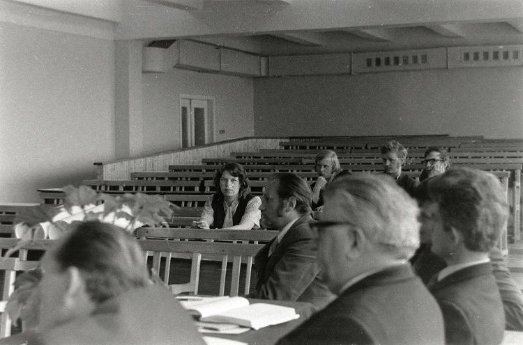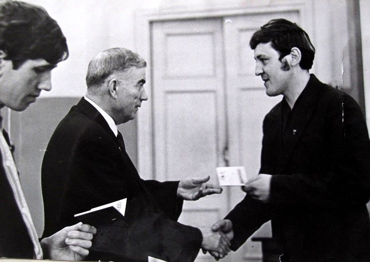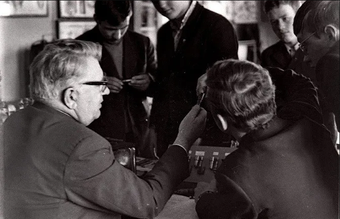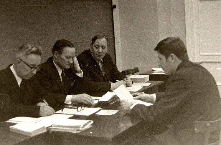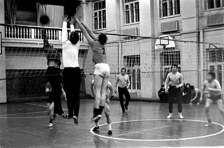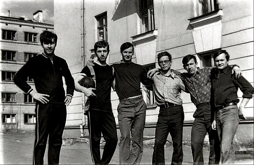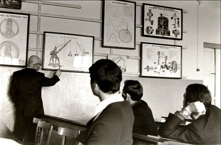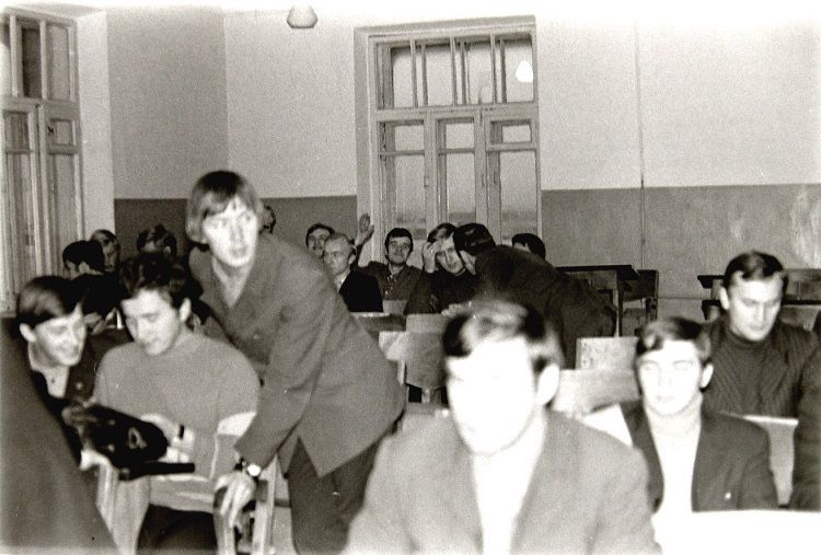 Продолжая знакомить со снимками Николая Антонова, скажу, что он на нашем факультете слыл маститым фотографом. И не только слыл, но и сотрудничал с институтской газетой «Наш темп». Для примера привожу лишь один его фотоснимок, опубликованный в газете в 1975 году: ![]() А фотографировал он и на переменах, и во время занятий, и даже при защите дипломных проектов: ![]() ![]() И запечатлел многих преподавателей АЛТИ, например, Игоря Алексеевича Чудинова (первый слева), Кирилла Андреевича Потяркина и Михаила Матвеевича Соловьёва: ![]() И Яноша Ференцевича Молнара, ведшего у нашей группы семинары по предмету «Экономика и организация производства». По сей день помню его произношение русских слов — со специфическим венгерским акцентом: А здесь Павел Федосеевич Марченко объясняет одногруппникам Николая принцип работы плунжерной пары топливного насоса дизельного автомобиля: ![]() Одногруппники и однокурсники Антонова были запечатлены и во время занятия по предмету «Детали машин». ![]() И в аудитории № 410 (угловой в главном корпусе, четвёртый этаж): ![]() И во время перемены: ![]() И при работе над курсовыми проектами в специально оснащённой кульманами и чертёжными столами аудитории «14-й общаги»: ![]() И за тем же занятием в комнате общежития (в той аудитории всем места не хватало, так как чертили студенты всех пяти курсов): ![]() ![]() И при вручении ректором И.М. Боховкиным и секретарём комитета ВЛКСМ Рядовкиным комсомольского билета нового образца: ![]() И во время факультетского вечера (подобия КВН) в актовом зале: ![]() ![]() И во время занятий в спортзале и плавательном бассейне: ![]() ![]() И отдыхающих под гитару на балконе общежития: ![]() И около этой же «14-й общаги» (Набережная имени Сталина/Ленина, 14) позирующих: «14-я общага» и типичная комната в ней: ![]() Фотографировал Николай Антонов ещё много где — и на производственной практике, и в стройотряде, и на военных сборах, и туристических походах. И даже однажды нашу группу в 1975 году во время занятий в мастерской кафедры технологии металлов. Сделал несколько снимков, когда нас учебный мастер инструктировал по технике безопасности при работе на токарных станках — прежде чем мы на них стали учиться работать. Но в газете «Наш темп» был опубликован лишь один фотоснимок, на котором я едва виден — за головным убором учебного мастера: ![]() В заключение не могу удержаться, чтобы сказать следующее. В конце 1980-х и в 1990-х годах очернители всего советского назвали период 1970-х «брежневским застоем». Если бы мы, студенты 1970-х, узнали бы тогда об этом, то очень бы удивились: «Какой застой — жизнь кипела как у нас, так и в стране!» Не собираюсь идеализировать то время, но замечу, что каких-либо идеологических запретов мы испытывали. Более того, слушали по радио зарубежные «голоса» и не скрывали этого факта. А как мы спорили и дискутировали с преподавателями общественно-политических дисциплин — истории, политэкономии, философии, научного коммунизма! Даже ведшая семинары по политэкономии преподаватель однажды назвала нашу группу «антисоветской». Хотя мы не сомневались в справедливости советского строя, а возмущались лишь различием между действительностью и тем, что официально провозглашалось. Но при этом радовались победе вьетнамского народа, падению проамериканского режима Сомосы в Никарагуа, крушению фашистских диктатур в Испании, Португ
