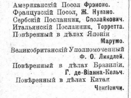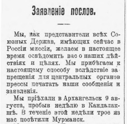 бельгийский — Фёдор Фёдорович Ландман (Троицкий пр., № 105) В дополнение к изложенному следует сказать на днях в одном из номеров архангельской меньшевистской газеты «Северный луч» за август 1918 года нашёл «Заявление послов», в котором, в частности, говорилось: ![]()