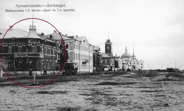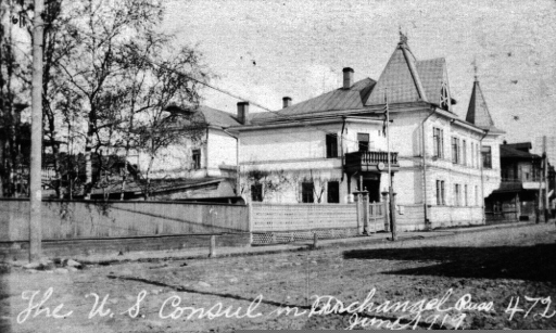 ![]() Английское и американское посольства, понятно, оказались на главном проспекте Архангельска — соответственно Троицкий, 65 и Троицкий, 55. Однако в другом источнике — в детройтской газете за 1919 год - иной адрес посольства США. Под фотоснимком, на котором запечатлён особняк Плотниковой — подпись: «Американское посольство в Архангельске» («The American Embassy at Archangel»): Помимо дипломатических представителей, в связи с интервенцией оказавшихся на Севере, в Архангельске продолжали работать и довоенные (точнее, дореволюционные) консулы: