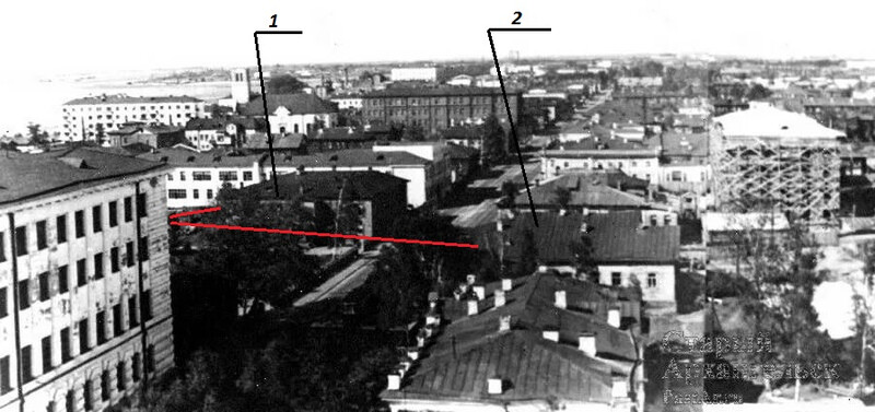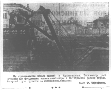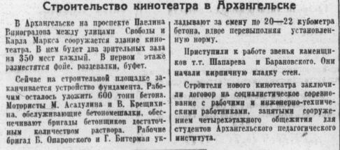 Как известно, архангельский кинотеатр «Мир» был торжественно открыт 6 ноября 1956 года. И об этом событии ранее сообщалось уже не раз как в печатных СМИ, так и в интернет-ресурсах. А вот информацию о том, когда здание кинотеатра начали строить, я нигде не находил. Пока не ознакомился с подшивкой газеты «Правда Севера» за второй и третий кварталы 1953 года, то есть за тот период, когда после кончины И.В. Сталина первым лицом государства являлся Г.М. Маленков, которого в газетных публикациях величали «главой Советского правительства»: А поскольку в своих выступлениях Г.М. Маленков предложил навести порядок в строительной отрасли, прекратить практику замораживания объектов и консервации средств, отпущенных на строительство, местные власти поспешили сделать соответствующие выводы и работа закипела, в частности, на площадке, где намечалось построить новый кинотеатр. И первая, сопровождённая фотоснимком публикация о начале его строительстве появилась в газете уже летом. На снимке был запечатлён экскаватор, роющий котлован: ![]() Чтобы сориентировать, с какой точки (А) было сделано это фото, привожу аэрофотоснимок центра Архангельска 1934 года и поясню, что дом 1 стоял перед строительной площадкой по нечётной стороне проспекта П. Виноградова (Троицкого), а дом два — на чётной: Эти же два дома на заимствованном с сайта Старый Архангельск снимке. Строительную площадку кинотеатра, к сожалению, на нём не видно — заслонена зданием мединститута: Более подробно о закипевшей на ней работе газета сообщила 5 сентября: ![]() Таким образом, с начавшегося ещё при Маленкове строительства кинотеатра началось и формирование нынешних площадей Мира и Павлина Виноградова, которое сопровождалось сносом старых зданий и возведением новых. ______________________________________________________Предыдущий пост - Борис Иванович и факультетская статистика |