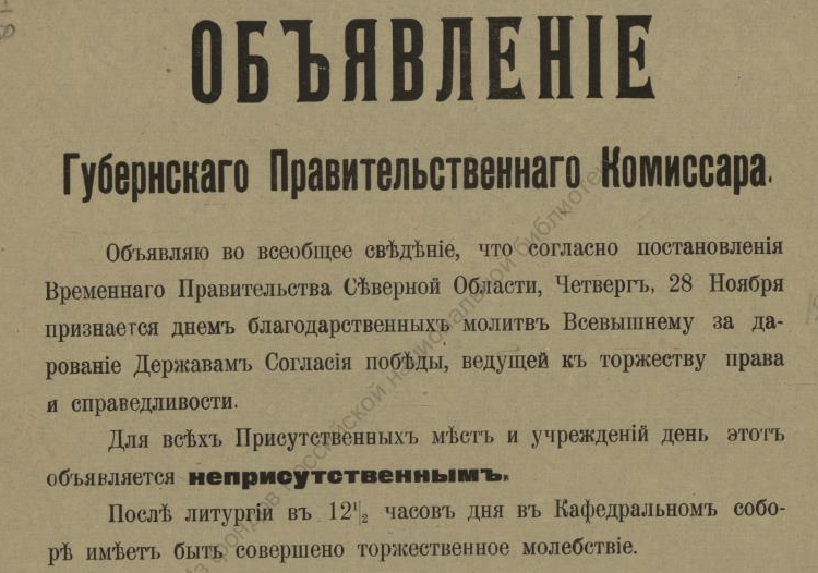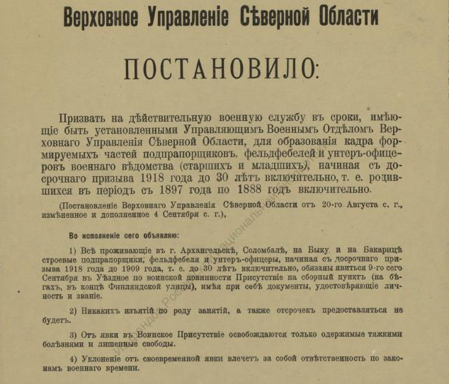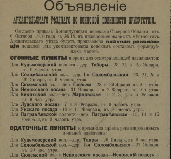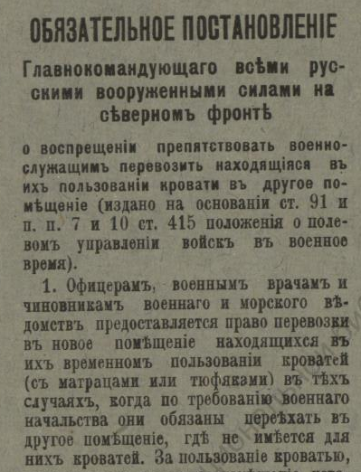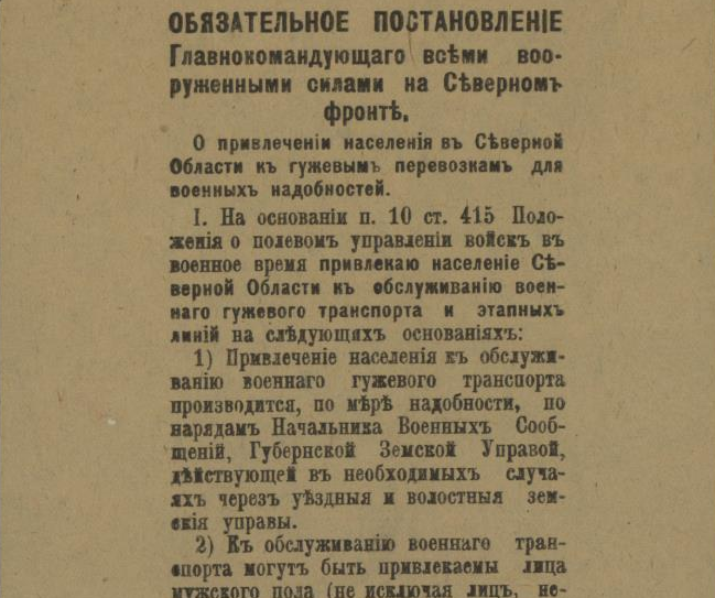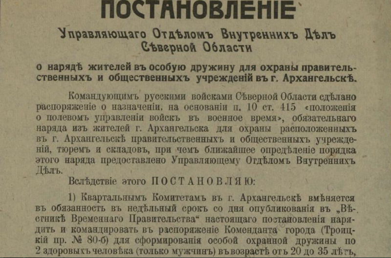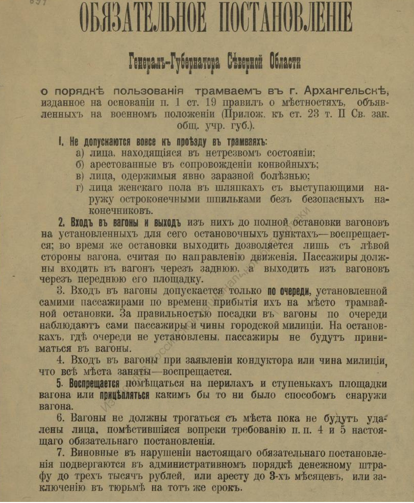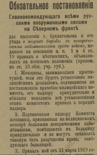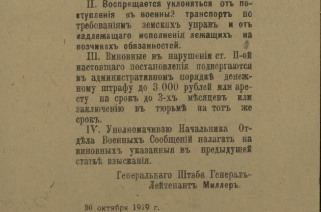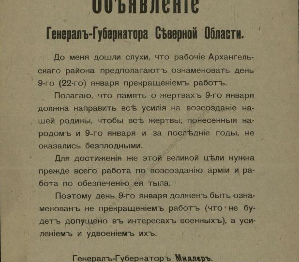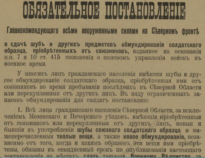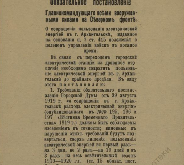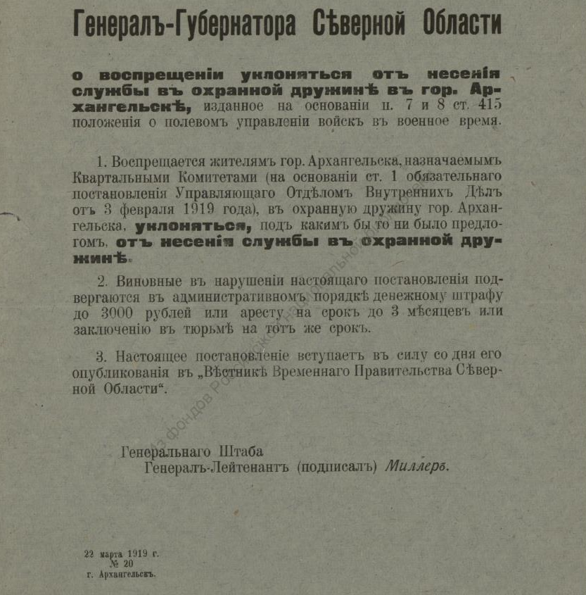 В недавнем сообщении «Красная газета» о красном Архангельске речь шла о напечатанной в петроградской газете статье, в которой, в частности, есть строки, свидетельствующие о том, что марте 1920 года на городских заборах приказы и воззвания Советской власти соседствовали с приказами власти бежавшей: ![]() О том, что содержалось в приказах и распоряжениях ушедшей в небытие белой власти, конечно, можно было бы и рассказать, но лучше ознакомить с их оригиналами. Например, так выглядело постановление о мобилизации: ![]() А так — объявление о реквизиции лошадей: ![]() Следующий документ, точнее, постановление предписывало сформировать особые дружины для охраны правительственных учреждений Архангельска, для чего каждый квартальный комитет города обязывался призвать в эти дружины «по 2 здоровых человека (только мужчин) в возрасте от 20 до 35 лет»: Другой документ — подписанное генералом Миллером обязательное постановление — извещал о привлечении населения Северной области к гужевым перевозкам для военной надобности. Постановление длиннющее, поэтому знакомлю лишь с его фрагментами: ![]() ![]() Опять же о наказании — вплоть до заключения в тюрьму — речь шла в ещё одном постановлении Миллера: ![]() Той же мере наказания подвергались и женщины лёгкого поведения, о чём свидетельствует постановление Миллера о мерах борьбы с венерическими заболеваниями в белых войсках: ![]() Было издано постановление и о порядке пользования трамваем в Архангельске: ![]() И о недопущении прекращения работ (по сути, забастовки) 21-го (9-го) января — в память жертв Кровавого воскресенья 1905 года: ![]() Однако 28-е ноября было объявлено днём неприсутственным (выходным), так как тот день был объявлен «днем благодарственных молитв Всевышнему за дарование Державам Согласия победы»: ![]() Миллером было издано постановление и об обязательной сдаче шуб и других предметов солдатского обмундирования, купленных населением у союзников-интервентов. За невыполнения постановления опять же грозило наказание — вплоть до тюремного заключения: ![]() Миллер подписал и обязательное постановление о сокращении пользования электроэнергией в Архангельске до крайнего предела: ![]() ![]() И о воспрещении препятствовать военнослужащим перевозить находящиеся в их пользовании кровати в другое помещение. Дело в том, что домовладельцы, к которым опять же постановлением подселили квартирантов-военнослужащих, конечно, возражали, когда последние, переселяясь на другие квартиры, забирали с собой предоставленные им хозяевами кровати с постельными принадлежностями. Теперь же — после выхода постановления — домовладельцам за препятствование грозило наказание — опять же вплоть до тюремного. ![]() ![]() В заключение остаётся сказать, что генерал Миллер подписал ещё не один десяток обязательных постановлений (например, о регистрации велосипедов и собак, о нормах покупки продуктов по карточкам, о паспортах жителей Северной области и другие) и всех их здесь мне сейчас не разместить. ______________________________________________________Предыдущий пост - «J. Thomson, T. Bonar & co» и Архангельск |