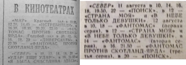 Поскольку в двух предыдущих постах речь так или иначе шла о кинотеатре «Мир», то сегодня продолжу «Мирскую» тему. И скажу, что сравнительно недавно — 4 сентября — я рассказал о коллективном (почти всем классом) побеге с уроков зимой 1966-1967 годов ради просмотра фильма «Их знали только в лицо» в другом кинотеатре — «Революция». Следует заметить, что в этом соломбальском кинотеатре мы, школьники 1960-х, были завсегдатаями. Ибо даже с моей улицы Валявкина неспешным шагом идти было недолго — минут 15-20. К тому же стоимость билета на утренние сеансы составляла всего лишь 10 копеек. Однако было одно «но»... Дело в том, что все новые киноленты в первую очередь демонстрировались в центральных кинотеатрах Архангельска — «Севере» и «Мире» («Искры» и «Руси» ещё не было), где были шикарные по той поре буфеты (особенно, в «Мире»), а в ожидании показа фильма для заранее пришедших в фойе выступал оркестр или показывали мультфильмы. Кроме того, внешний облик и внутренний интерьер «Мира», исполненные в стиле сталинского ампира, с огромными, медленно гаснувшими в залах люстрами, вызывали ещё по-детски непосредственное чувство, схожее с благоговением. Особенно в сравнении с аскетичной по облику «Революцией». Именно поэтому после «Революции» вторым кинотеатром, который я стал самостоятельно посещать, оказался «Мир». Да, билеты в нём были немного дороже — копеек на пять-десять. Но посмотреть киноновинку одним из первых в Архангельске — стоило того. Да и добираться до «Мира» было просто — сел на остановке «улица Таймырская» на трамвай 1-го маршрута, бросил три копейки в кассу, оторвал билет и минут через пятнадцать у цели. Именно так я поступил и в один из летних дней 1967-го. Но прежде из газеты «Правда Севера» (а её тогда приносили с первой, утренней доставкой почты - до 8 часов) узнал, что в «Мире», точнее, в его «Красном» зале в тот день демонстрировался цветной франко-итальянский фильм «Три мушкетёра». И решил его посмотреть... Когда я подошёл к кинотеатру, то узнал, что в другом зале — «Голубом» — впервые показывали ещё один французский фильм с непонятным и ничего не говорящим названием — «Фантомас». «Три мушкетёра» — это предельно ясно, а тут какой-то «Фантомас»... К тому же слово «кинокомедия» в киноафише на фасаде кинотеатра поначалу отсутствовало. И изображённый на ней Луи де Фюнес (в роли комиссара Жюва) был ещё малоизвестен советскому кинозрителю, в том числе и архангельскому. Поэтому желающих купить билеты на «Фантомаса» в тот будний день были единицы. В основном школьники, уже посмотревшие «Трёх мушкетёров».. Но когда я выходил из кинотеатра после окончания сеанса (а фильмы в обоих залах заканчивались иногда примерно одновременно), то не мог не обратить внимание на реакцию мальчишек, просмотревших новый фильм — они не спешили разойтись и эмоционально обсуждали увиденное. И весьма заразительно. Причём настолько, что на следующий день я снова оказался в «Мире» и в уже в битком заполненном в основном моими ровесниками зале. ![]() Вскоре первую серию «Фантомаса» посмотрел, наверное, каждый посещавший кинотеатры архангелогородец, а ребятня — не по одному разу. Затем последовало продолжение — фильмы «Фантомас разбушевался» и «Фантомас против Скотланд-Ярда». Эта французская кинотрилогия стала одним из лидеров советского проката. Первый фильм просмотрели