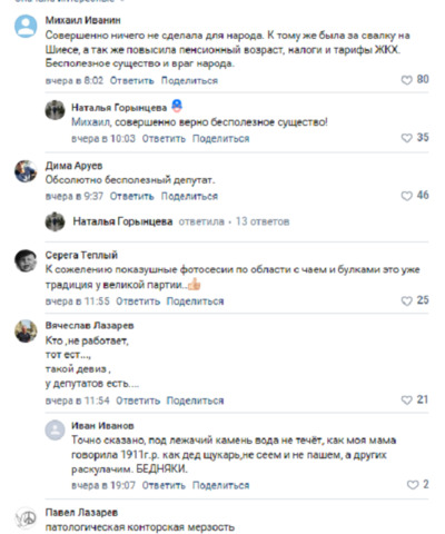 На днях в паблике Эхо Котласа был размещён пост с фотоснимком, на первом плане которого — депутат-единоросс Госдумы Елена Вторыгина, а также министр труда, занятости и социального развития области Владимир Торопов и депутат облсобрания Елена Доценко (понятно, тоже единоросска). В общем, представители современной партноменклатуры: ![]() А под постом множество негативных комментариев, и в прежде всего в адрес Вторыгиной. Вот лишь некоторые из них: Почему, комментарии негативные? — Да по той причине, что единоросс Вторыгина абсолютно ничего не сделала для жителей юга Архангельской области. Не замечала и не замечает их беды, особенно связанные с оптимизацией медицины. И никто не забыл её позицию — одобрям-с! — по поводу планировавшейся московской свалки в Шиесе. В этой связи уместно задать вопрос: а что сделали для жителей области другие получающие месячное жалование в несколько сот тысяч депутаты-единороссы Госдумы: Спиридонов и Кисляков. Вы что-нибудь о их «кипучей деятельности на благо северян» слышали? О втором из них я последний раз слышал в 2023 году — в сообщении сайта Беломорканал от 23 сентября под названием Депутат Госдумы от Архангельской области Михаил Кисляков написал заявление о мобилизации говорилось: Михаил Кисляков заявил, что собирается сам принять участие в спецоперации. По его словам, о готовности заявили и два его сына, прошедшие срочную службу. Но, увы, с сыновьями в окопах СВО он так и не был замечен. На вопрос, почему, предположение сделал тот же сайт: Заявление, видимо, затерялось... А что сделали для свалившейся в долговую яму области члены Совета Федерации Иван Новиков и недавно в ней трудоустроенный бывший глава «Роскосмоса» Юрий Борисов. Видимо, примерно то же, что и бывшие сенаторы от Архангельской области — пожалуй, ничего... Даже подоходный налог с их миллионных доходов поступает в столичный бюджет. То же самое можно сказать и предыдущих «народных» избранниках-единороссах, например, о сенаторах Львове, Владимире Рушайло и попавшем в Госдуму с помощью административного ресурса Виталии Предыбайлове. Помните таких? А об их «вкладе» в развитие области уже и не спрашиваю... И что примечательно — по поводу нулевых результатов своей деятельности представителям современной партноменклатуры беспокоится, конечно, не надо. Так как их куда-нибудь — на другое тёплое и хорошо оплачиваемое место — в любом случае пристроят. Побыл(а) областным министром — стал(а) депутатом облсобрания. Или наоборот. Контор много всяких, хотя и бесполезных. На крайний случай есть Общественная палата области, в которую отставные депутаты-единороссы и партфункционеры почему-то стремятся. Видимо, сии места чем-то намазаны... А чтобы мы, жители области и страны, не узнали, как жирно намазаны чиновничьи и депутатские кресла, на днях большинство «Единой России» в Государственной Думе (в том числе Вторыгина, Кисляков, Спиридонов) приняло закон, который снимает с чиновников обязанность ежегодно подавать декларации о доходах и расходах. Кроме того, опять же единороссовским большинством Госдумы подготовлен и, понятно, срочно будет принят другой законопроект — от обязанности подавать подобные декларации освободят и депутатов. А делается это по той причине, что в следующем году состоятся выборы в Госдуму. И в этой связи чиновникам и депутатам-е