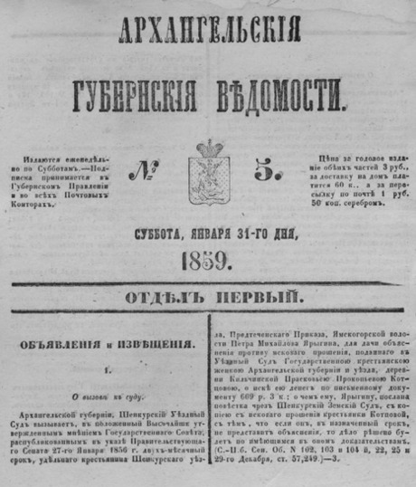 В одном из номеров за 1859 год издававшейся в Петербурге газеты «Русский мир» встретил несколько присланных из Архангельска корреспонденций. В первой из них рассказывалось о попытке местных властей избавиться от излишнего количества сверхштатных и уволенных за взяточничество и другие должностные преступления чиновников, семьям которых тем не менее по тогдашним правилам выделялись денежные пособия. Что обременяло, вернее, опустошало и без того тощую губернскую казну: