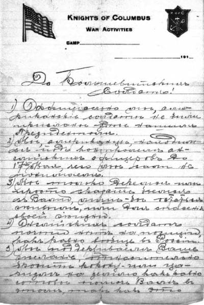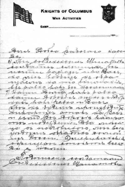 Среди общедоступных документов периода интервенции, хранящихся в библиотеке Мичиганского университета, нашлось и письмо американских солдат, адресованное противникам — большевикам-красноармейцам. Причина его появления, скорее всего, следующая: заокеанским солдатам, привезённым воевать с большевиками на Архангельский Север и оказавшимся по приказу командующего войсками интервентов — английского генерала Айронсайда — в суровых климатических условиях по приказу и к тому же на передовой, конечно, вовсе не хотелось здесь, в северных лесах и болотах, погибать. Причём, непонятно, за чьи интересы. Поэтому весной 1919 года некоторые из них, считавших дни до намеченной даты отъезда на родину, и решили договориться с противниками, которых в своем письме назвали «камратами» (камрадами, то есть товарищами), не вести в оставшееся время — два с половиной месяца — никаких активных боевых действий. Мол, мы до отъезда не будем производить никаких атак, и вы тоже, пожалуйста... Примечательно, что писавшие, с одной стороны, выгораживали своего президента (нас он официально сюда не посылал), с другой, всю ответственность пытались свалить на союзников — англичан. А это весьма любопытный факт, характеризующий взаимоотношения между интервентами. Интересно и то, что письмо было написано на бланках «Knights of Columbus» (сокращенно KofC, в переводе «Рыцари Колумба») — американской католической благотворительной организации, имевшей (и ныне имеющей) свои отделения на военных базах США и в экспедиционных войсках. Современную эмблему этой организации привожу ниже: ![]() Текст письма был написан, понятно, на русском языке. Писавший его и, видимо, переводивший с английского, скорее всего, был тоже русским. Об этом свидетельствует беглый почерк и написание ряда букв, например, «т», «ш» и «н». Однако он писал с орфографическими ошибками и переводил, видимо, по словарю, чисто механически. Поэтому некоторые словосочетания, английскому языку, возможно, свойственные (например, «долг добра рабочего народа») по-русски выглядят «неудобоваримо». Впрочем, о том, как он писал и переводил, составить впечатление может каждый, ознакомившиеся сначала с фотоснимками письма, а затем и с его текстом, приведённым с сохранением ошибок и в дореволюционной орфографии. ![]() ![]()