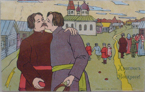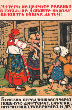Зараза, благодаря этим праздникам, проникла и в другие сёла и там, в свою очередь образуются новые ячейки. Большинство крестьян не имеет даже ни малейшего понятия о всех ужасах болезни и ее последствиях, а о предосторожности и говорить не приходится. Зачастую видишь, как мужик — явный сифилитик — христосуется со знакомыми. Без боли в сердце на этот акт целования смотреть невозможно. Дореволюционная пасхальная открытка
