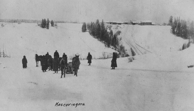 В недавнем сообщении о поездке Ф.Ф. Тимнера в 1914 году на автомобиле «Форд» из Ревеля (Таллина) в Архангельск был приведён текст газетной заметки, в которой, в частности, говорилось: Автомобиль шёл и быстрым, и тихим ходом, часто преодолевая препятствия. Особенные затруднения ставили размытые осенними дождями, особенно в нашей, Архангельской губернии. Так, например, около Коскова автомобиль еле-еле выбрался из глины, составляющую главную часть почвы. В этой связи замечу, что, видимо, наибольшие затруднения вблизи деревни Косково встретились при подъёме вот в этом месте почтового тракта (у Косковой Горы), которое было запечатлено интервентами зимой 1918-1919 годов: Этот фотоснимок заимствован мной с сайта библиотеки Мичиганского университета (США). А следующий, 2010 года — с сайта foto-planeta.com, актор — kisych. ![]() Сравнение этих двух фотоснимков позволяет заключить, что они сделаны примерно с одной точки. Причём можно сказать, что за прошедшее столетие сохранились по крайней мере два крайних деревенских дома. Местность, конечно, немного изменилась — в основном за счёт того, что слева от проселочной дороги вырос лес. А вот небольшой лесок на дальнем склоне сохранился, и вполне вероятно, что некоторые из запечатленных почти век назад его деревьев (елей, если не ошибаюсь) растут и по сей день. Я попытался поискать более свежий снимок данной местности, и, возможно, на найденном — это она, но сфотографированная с противоположной точки: В дополнение — ещё одно фото (с сайта pastvu), на котором запечатлена проезжающая по деревне Косково колонна автомобилей. А в них — участники торжеств по случаю 250-летия со дня рождения Ломоносова (1961 год), отправившиеся из Архангельска в Холмогоры: _____________________________________________________Предыдущий пост - О Доске Почёта и левой ноге |