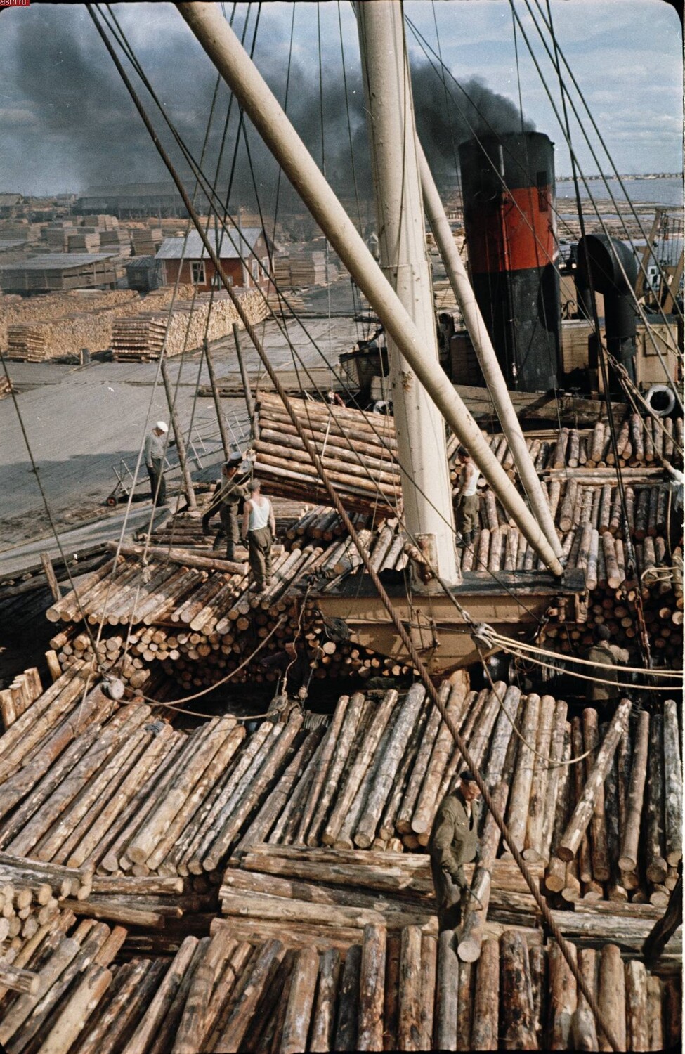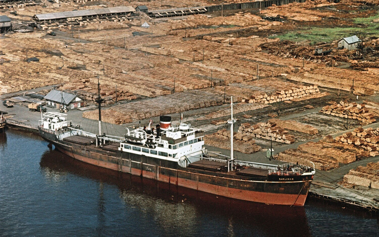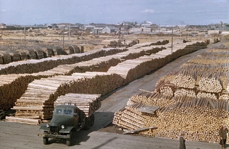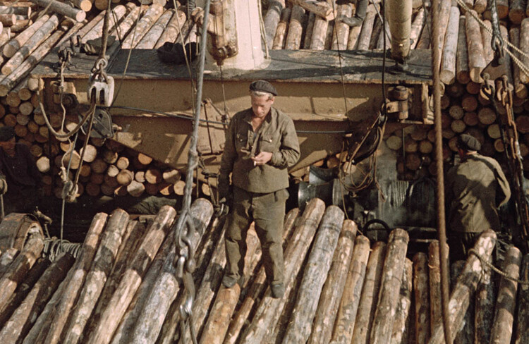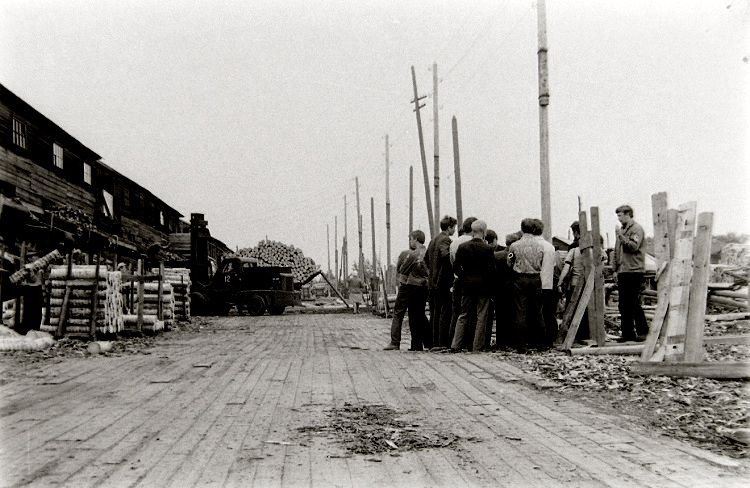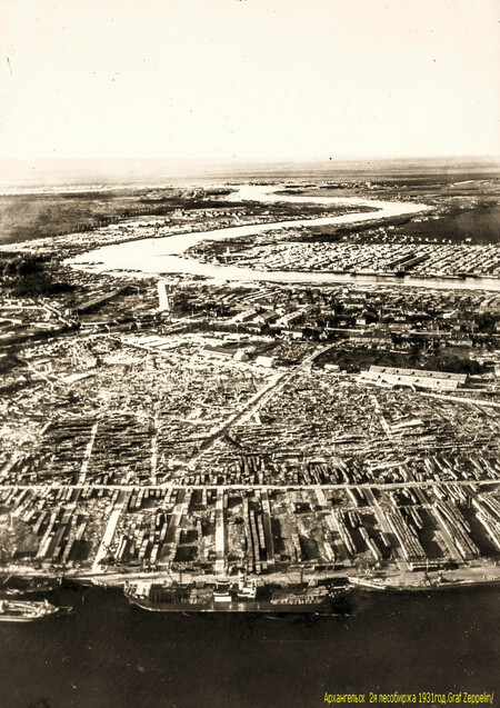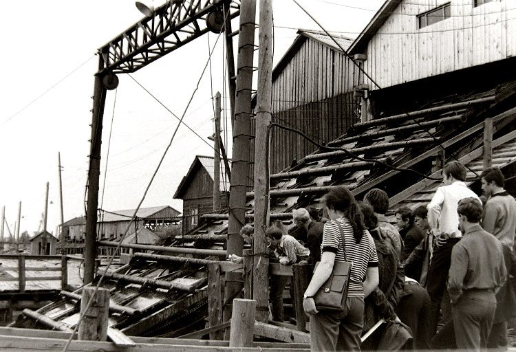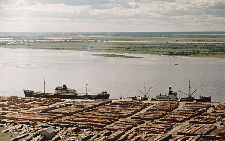 Завершая рассказ о снимках Николай Антонова середины 1970-х годов, сегодня привожу фото, сделанные летом 1974-го во время экскурсии или производственной практики студентов АЛТИ в располагавшемся на острове Бревенник Маймаксанском лесном порту (МЛП) — архангельском лесоэкспортном предприятии, специализировавшемся на поставках за границу частично обработанной лесопродукции. И именно окоренных брёвен и короткомерных сортиментов — балансов и пропсов. Производственный цикл начинался с подъёма с воды приплавленной по Двине древесины с помощью поперечного элеватора: ![]() ![]() ![]() А после окорки и раскряжёвки сортименты на сортировочной площадке пакетировались: ![]() Эта же сортплощадка МЛП достаточно хорошо видна на сделанном в 1958 году Семёном Фридляндом снимке: Ещё несколько фото, сделанных Фридляндом в тот же летний день 1958-го: А это снимок 1970-х годов: Наконец, самый ранний по времени снимок МЛП (называвшегося первоначально Лесобиржей № 2) — сделан в 1931 году с борта немецкого дирижабля «Граф Цеппелин». На первом плане — предприятие с причалами, далее — посёлок (бывшее село Корабельное) и Маймаксанский руках Северной Двины: ______________________________________________________Предыдущий пост - Наша «военка» |